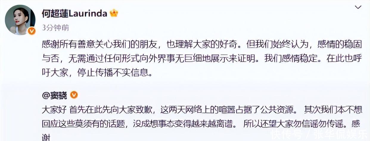 两人一起出现的画面本就不多,何超莲事业一路高歌猛进时,似乎也没怎么带着另一半,这种发展上的不平衡,让不少人吐槽其伴侣是在靠她吃软饭,谈恋爱专挑有钱的对象。起初两人挺纠结,回应吧感觉有点过度反应,不回应吧网友又都以为他们分手了。后来这事儿一直没消停,他们只好出来说明,说两人关系好着呢,没必要向别人证明什么。